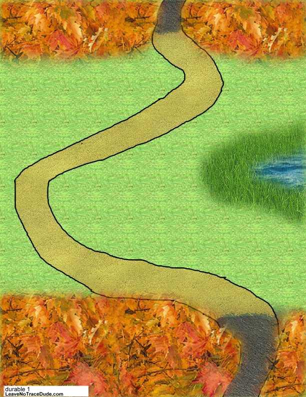 Ask the audience how they should cross this meadow. Hopefully, someone will say hikers should spread out and disperse traffic.